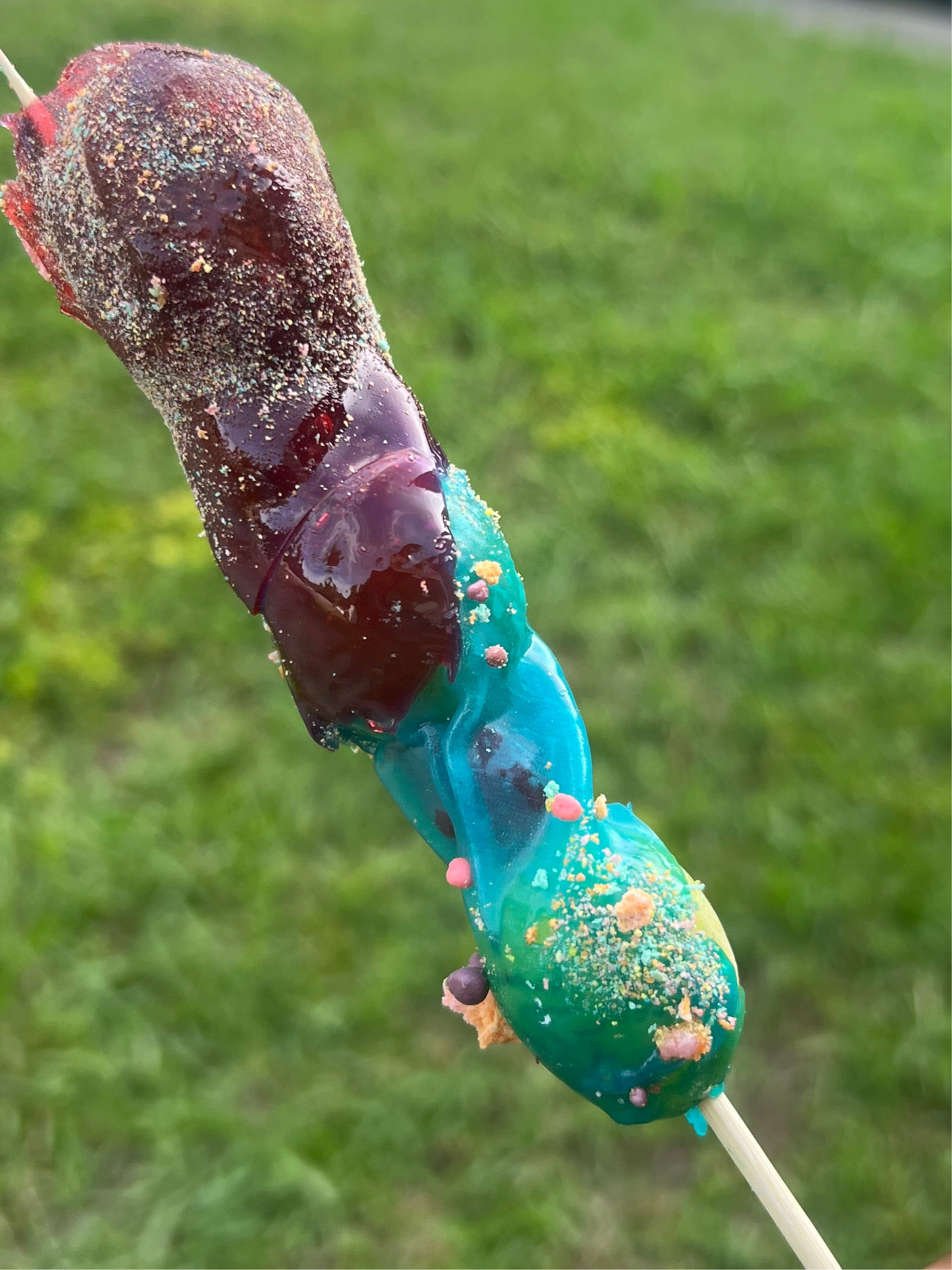 Candy covered gusher grapes wrapped in fruit roll ups.