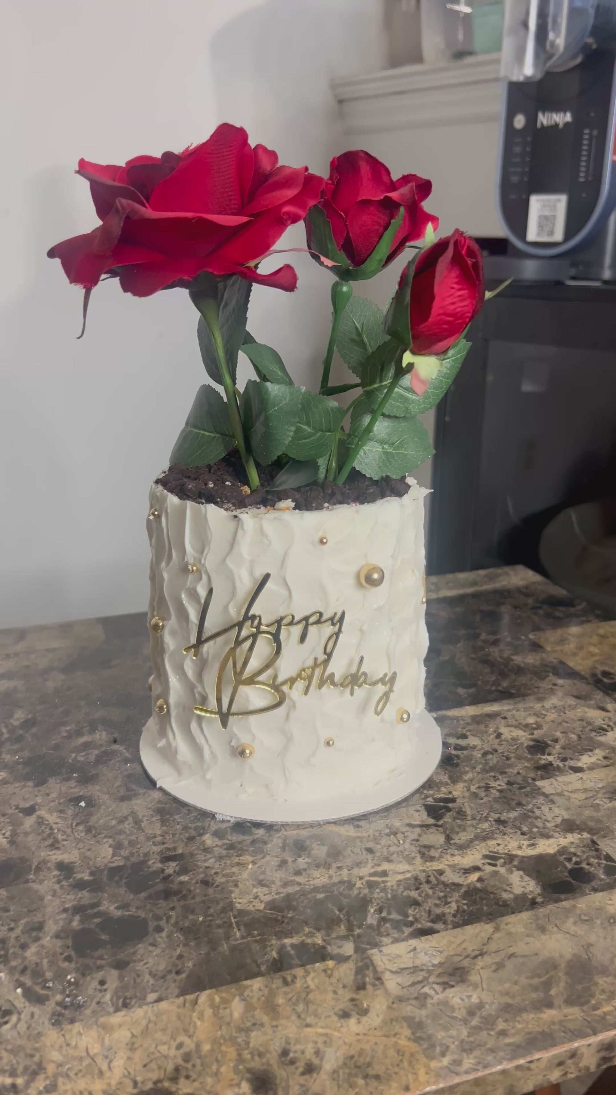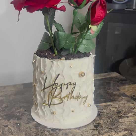 A 5-inch, 3-layer cake filled and coated with smooth buttercream and white chocolate. Finished with Oreo “dirt” topping and rose florals for an elegant garden-style look.